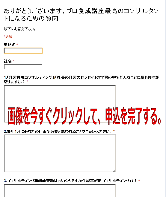 | 【一人ビジネスMBA】プロ養成基礎講座2日間お申し込みありがとうございます。 まだ、お申込は完了していません。 以下の画像をクリックして、質問に回答してください。