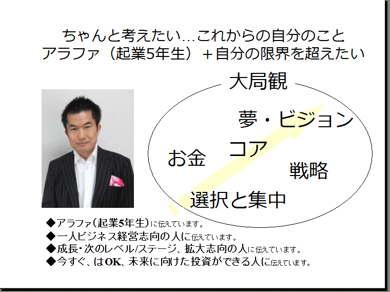 追記:今回のサポート内容は「お金」が切り口ですので「お金の相談」みたいですが、お金の専門家に相談しても事業のどこをどう改善・改革していくかは自分でやっていきます。西田の差異は戦略・マーケティングなど売れる側面が先にありきで、お金の部分を入り口としたことです。 |